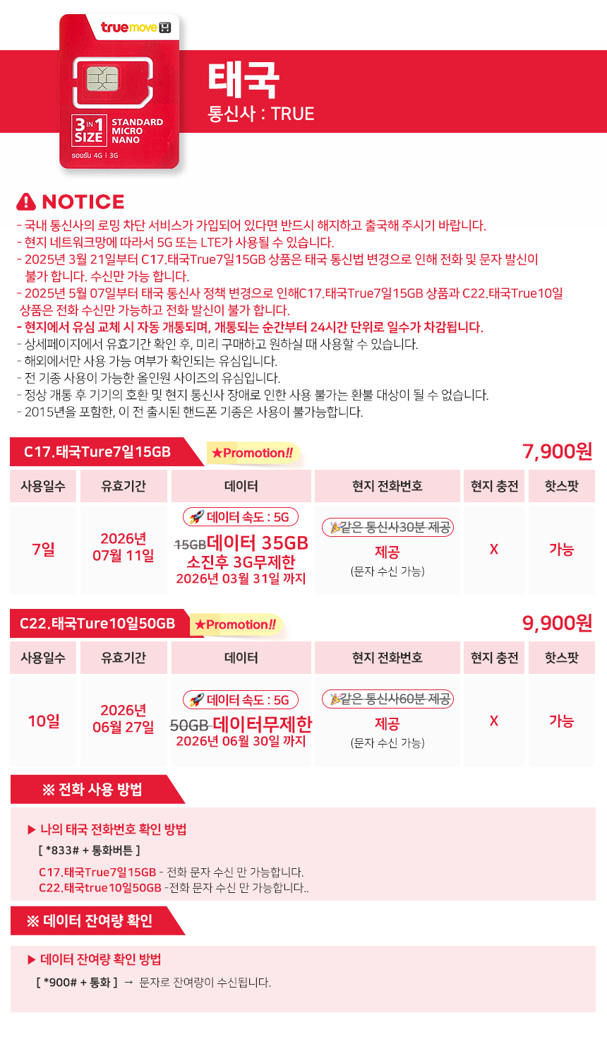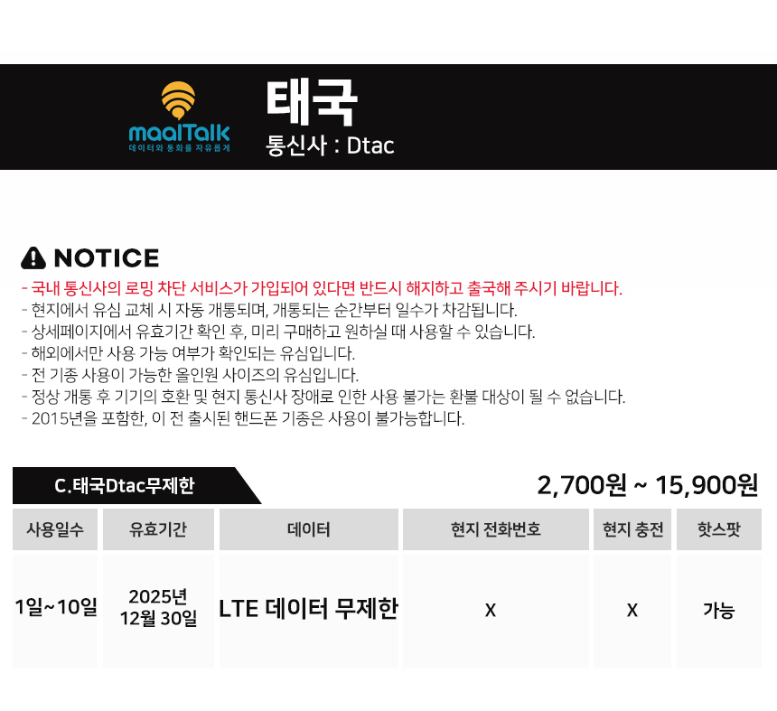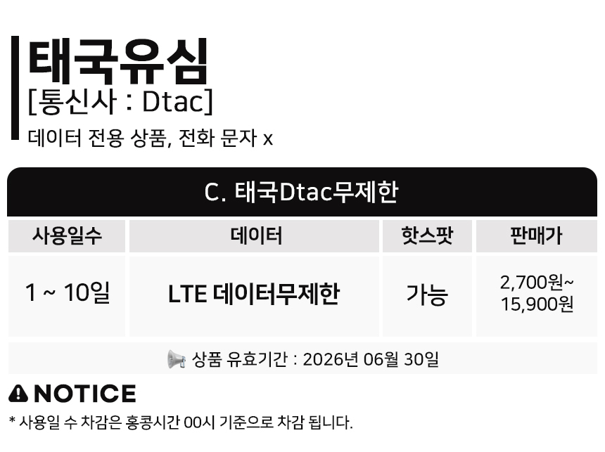 [태국전체상품/유심] LTE데이터무제한 AIS/True/Dtac 현지번호제공