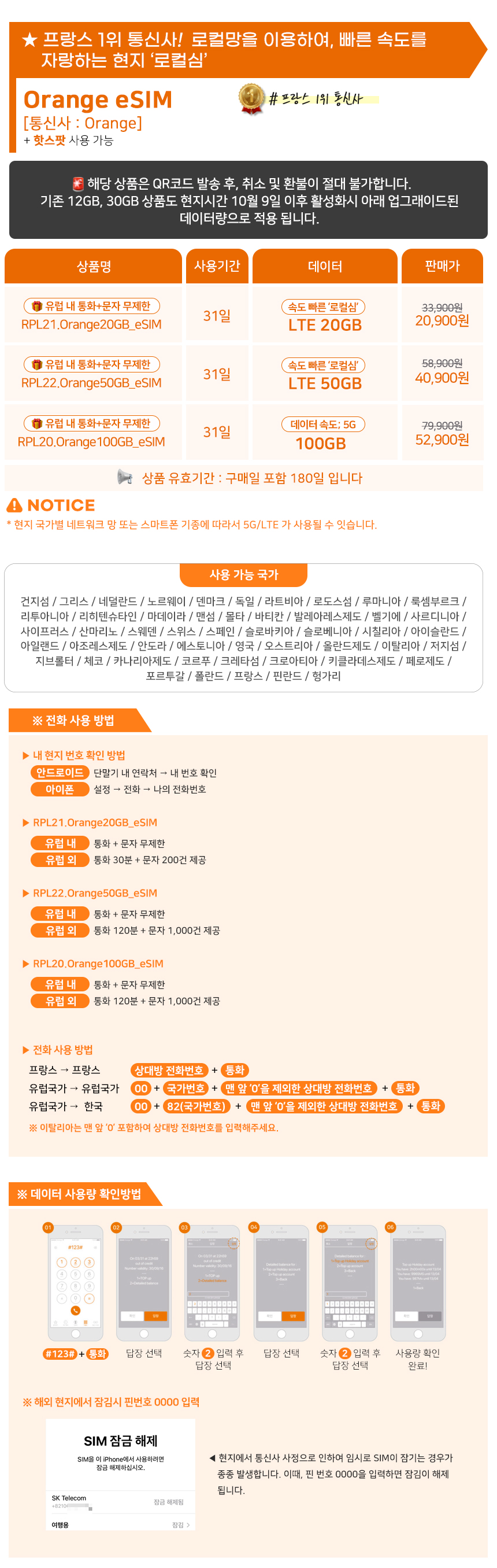 [유럽아시아/esim] QR코드 사용 이심. 5G 속도 데이터무제한 일자별선택, 유럽 아시아 국가 사용 가능 Orange 로컬망