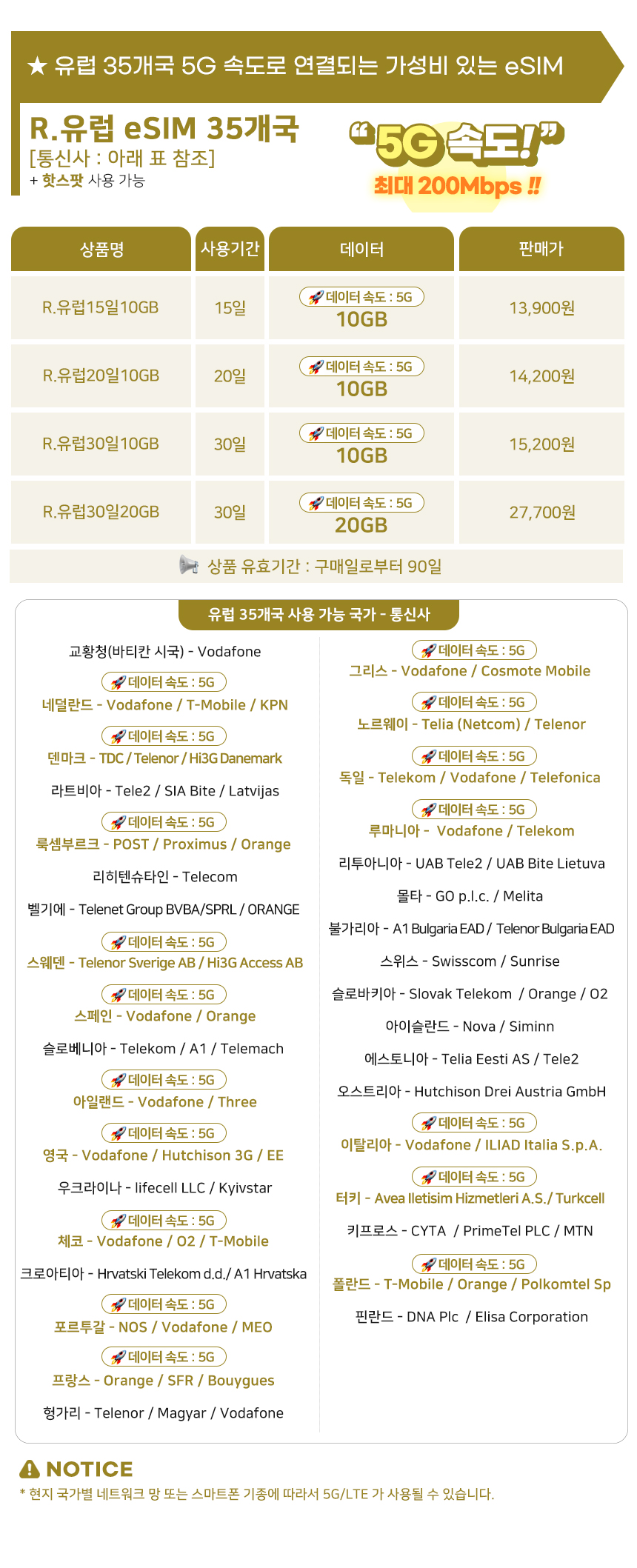 1000000359 [유럽/esim] 유럽 35개국 현지 로컬망 사용 15일,20일,30일 5G속도 이심 13900