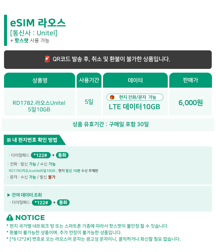 1000000371 [라오스/esim] 라오스 현지 로컬망 사용 이심. 유니텔 통화 문자 수신 가능 6000